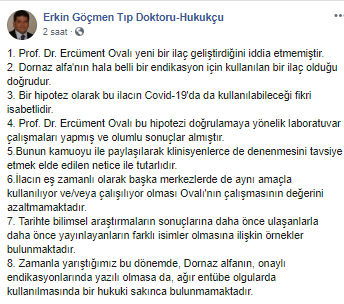 Koronavirüs aşısı için çalışmalar yürüten ve dün gece bir açıklama yaparak Dornaz alfa'nın acilen klinik testlere alınması gerektiğini belirten Prof. Dr. Ercüment Ovalı'dan yeni bir paylaşım geldi. Paylaşımda, "Prof. Dr. Ercüment Ovalı yeni bir ilaç geliştirdiğini iddia etmemiştir. Ovalı bu hipotezi doğrulamaya yönelik laboratuvar çalışmaları yapmış ve olumlu sonuçlar almıştır" ifadelerine yer verildi.