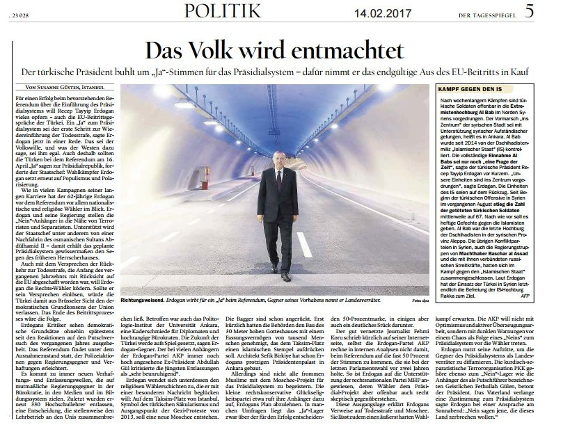 Almanya'da yayın yapan Der Tagesspiegel gazetesinde Susanne Güsten imzasıyla çıkan haberde; CumhurbaşkanıRecep Tayyip Erdoğan'ın anayasa değişikliği teklifi için yapılacak referandumdaki kararı değerlendirildi.