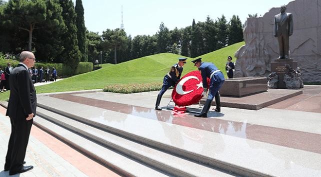 Haydar Aliyev'in anıt mezarına çelenk bırakan Erdoğan, daha sonra Aliyev'in eşi Zarife Aliyeva'nın mezarına çiçek koydu. Başkan Erdoğan, 20 Ocak Şehitleri'nin yer aldığı Bakü Şehitler Hıyabanı'nda da Ebedi Ateş Anıtı'na çelenk bıraktı.