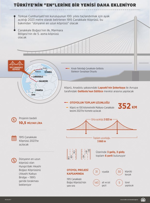 Tamamlandığında "dünyanın en büyük orta açıklıklı asma köprüsü" unvanını alacak, renkleri, figürleri ve diğer özellikleriyle "simgelerin köprüsü" olacak 1915 Çanakkale Köprüsü'ne değinen Başkan Erdoğan "Başka bir adım daha atıyoruz. CHP, isterseniz onu da engellemeye çalışın. 18 Mart Çanakkale Köprüsünü yapıyoruz. dedi.