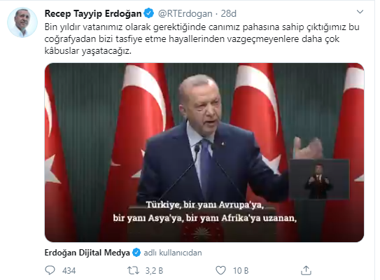 Cumhurbaşkanı Erdoğan Twitter hesabında kendi konuşmasının yer aldığı görüntüleri paylaştı. Görüntülerdeki konuşmasında, Türkiye’nin kararlılıkla hedeflerine yürümeyi sürdürdüğü vurgusu yapan Erdoğan, “Doğu Akdeniz’de ülkemizin ve Kıbrıs Türklerinin haklarının pervasızca gaspına boyun eğmedik, eğmeyeceğiz.” ifadelerini kullandı.