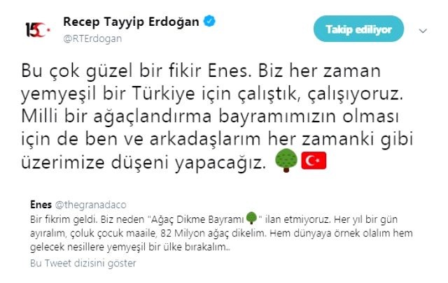 Cumhurbaşkanı Erdoğan Twitter'dan yayınladığı mesajında, "Bu çok güzel bir fikir Enes. Biz her zaman yemyeşil bir Türkiye için çalıştık, çalışıyoruz. Milli bir ağaçlandırma bayramımızın olması için de ben ve arkadaşlarım her zamanki gibi üzerimize düşeni yapacağız" ifadelerine yer verdi.
