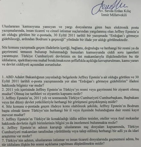 Kılıç sosyal medyada da paylaştığı soru önergesine"ABD Adalet Bakanlığı'nın açıkladığı e-posta yazışmalarında, Jeffrey Epstein'ın "Erdoğan'ı görmeye gidebileceğini" yazdığı görülüyor. TBMM'ye soru önergesi verdim: Bu görüşme gerçekleşti mi? Türkiye'nin en üst makamlarını ilgilendiren bu iddia yoruma değil, açık ve net bir açıklamaya muhtaçtır."notunu düştü.