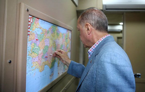 Türkiye'nin dört bir tarafını dolaşarak seçim çalışmalarını sürdüren Erdoğan, harita ile gittiği illeri işaretliyor.