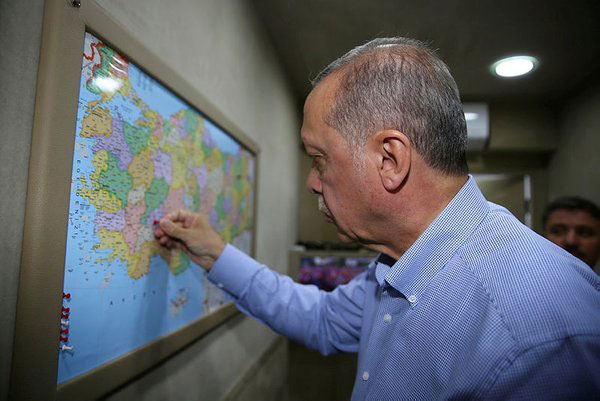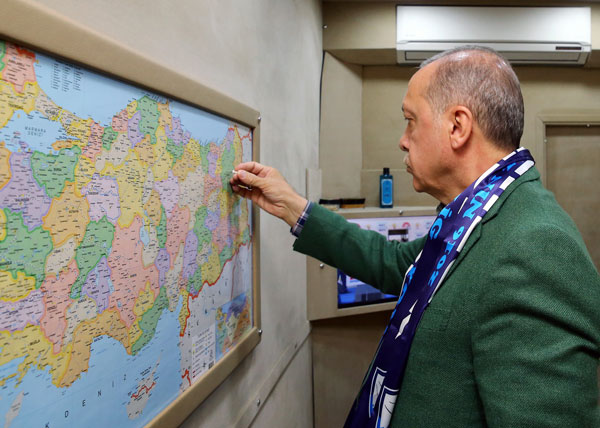 Aksaray'a geldiği zaman yine haritayla meşgul olan Erdoğan, gittiği şehrin üzerini raptiyeyle işaretledi.
