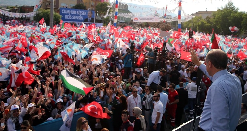 Gökdere Meydanı'nda düzenlenen mitinge katılmak üzere kente gelen Cumhurbaşkanı adayı ve Başbakan Recep Tayyip Erdoğan, eşi Emine Erdoğan, Başbakan Yardımcısı Bülent Arınç, AK Parti Genel Başkan Yardımcısı Hüseyin Çelik ve AK Parti Genel Başkanı Başdanışmanı Binali Yıldırım ile otobüse binerek, Atatürk Caddesi'ndeki tarihi Valilik binasına geçti.