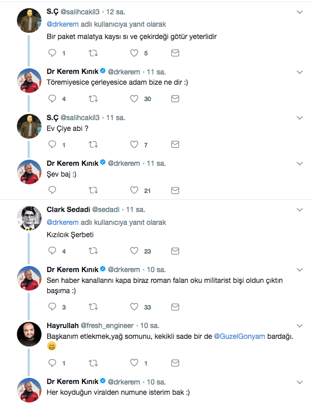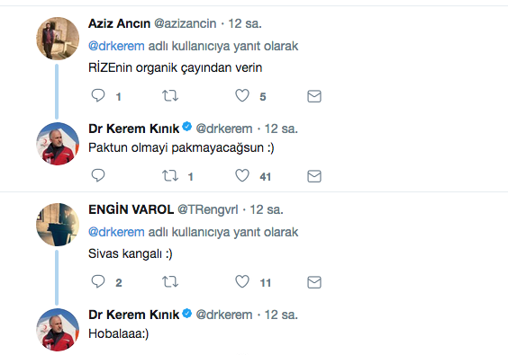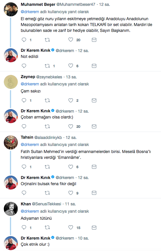 Bu soruyla birlikte twitter alemi coştu. Öneriler içinde sanatsal hediyeler olduğu gibi yöresel ürünler de vardı. Kerem Kınık'a en şık öneri de Yeryüzü doktorları grubundan geldi. Yeryüzü Doktorları "Anadolu kültürünü en iyi yansıtacak şey bu toprakların cömertliğidir diye düşünüyoruz. Ziyaret edeceğiniz kişi adına bağış yaparak bir hayat kurtarmaya ne dersiniz? Sertifikası da bizden :)" twitini attı.