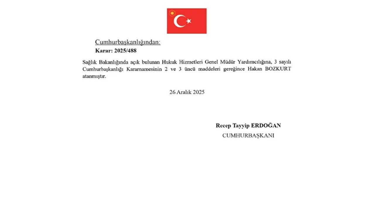 Karar ile birlikte Sağlık Bakanlığına açık bulunan Hukuk Hizmetleri Genel Müdür Yardımcılığına Hakan Bozkurt atandı.