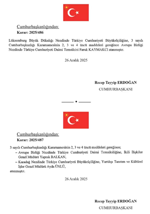 Cumhurbaşkanı Recep Tayyip Erdoğan'ın imzası ile yayımlanan karar ile birlikte, Lüksemburg Büyük Dükalığı nezdinde Türkiye Cumhuriyeti Büyükelçiliğine, Avrupa Birliği nezdinde Türkiye Cumhuriyeti Daimi Temsilcisi Faruk Kaymakçı atandı.