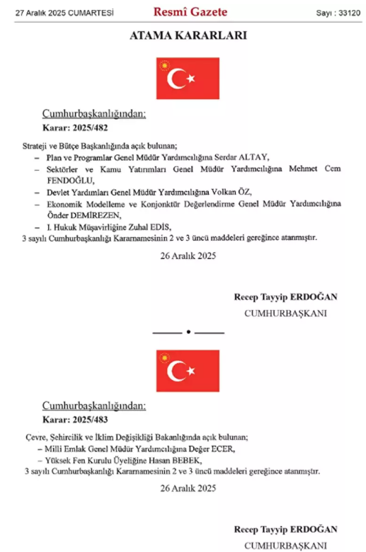 Resmi Gazete'de yayımlanan Cumhurbaşkanı kararlarıyla birlikte kamu kurumlarında önemli görev değişiklikleri yapıldı. Cumhurbaşkanı Recep Tayyip Erdoğan'ın imzasını taşıyan atama kararları şu şekilde...