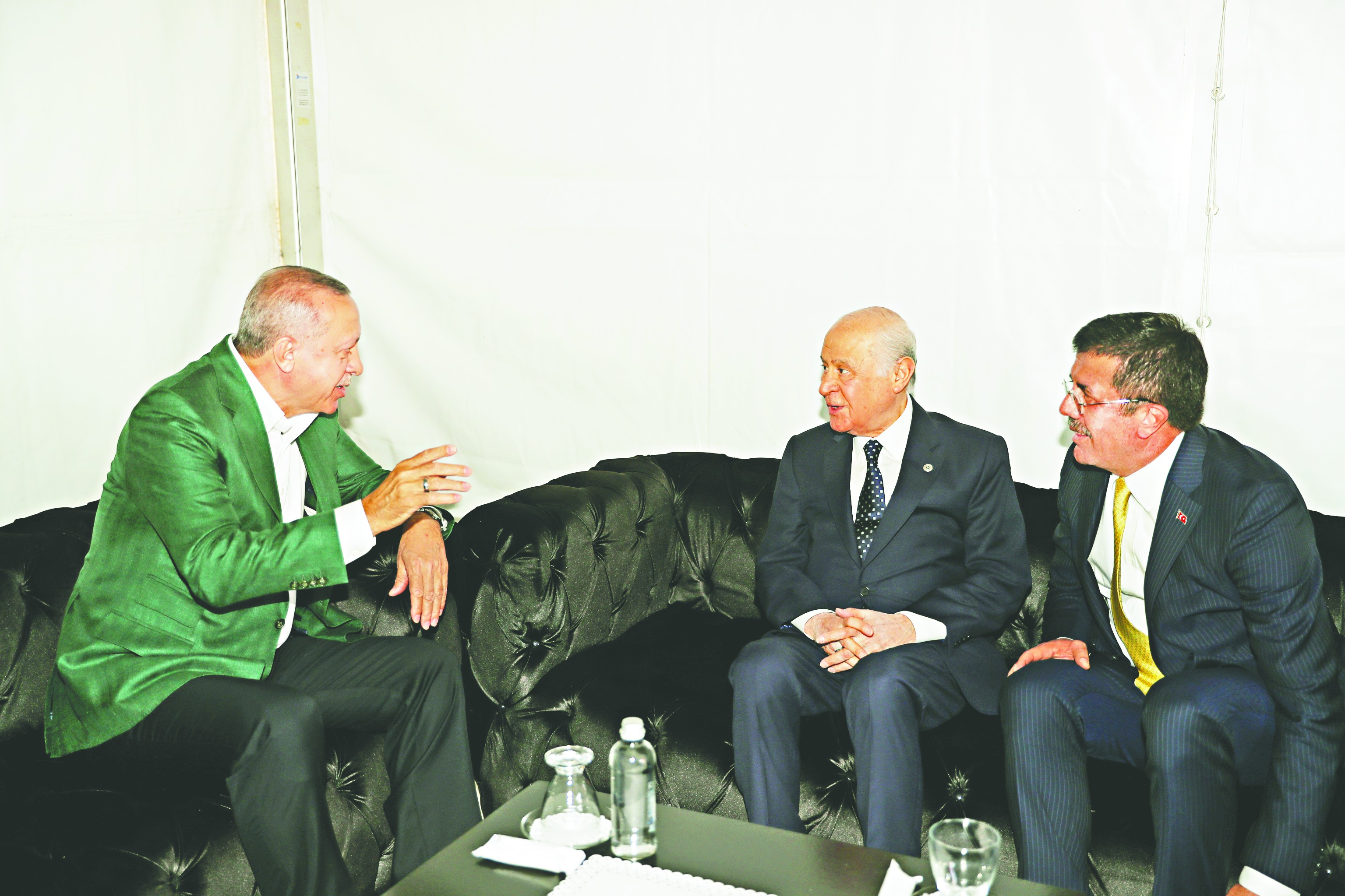 -Erdoğan, Bahçeli ve Büyükşehir Belediye Başkan Adayı Nihat Zeybekci kuliste sohbet etti.