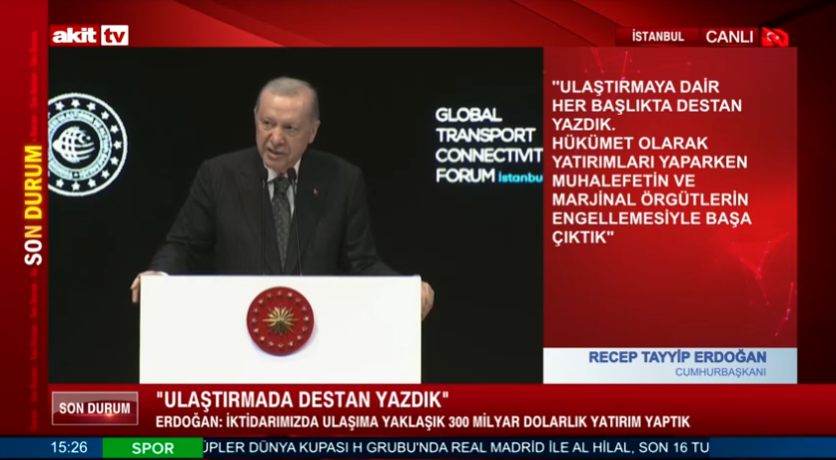 Tüm bu yatırımları yaparken engellemeye çalışan muhalefet ile de mücadele ettik. İstanbul Havalimanı ile ilgili hep iftira attılar. Yeni yol yaparak trafik sorunu çözülmez dediler, gün oldu göçü hızlandırır iddiaları ile hızlı tren projelerini engellemeye çalıştılar. Hizmetlerimizi dinamitlemeye çalıştılar. Hizmetlerimizi dinamitlemeye çalıştılar. Muhalefet ideolojik konfor alanının dışına çıkmaya yanaşmadı. Biz takoz siyasetine hiç bir zaman teslim olmadık.