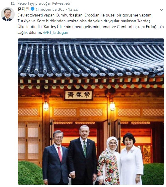 Cumhurbaşkanı Erdoğan, Moon Jae-in'in bu tweetini retweet yaptı.