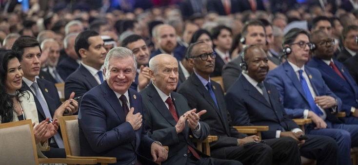 Yanında bulunan Özbekistan Cumhurbaşkanı Şevket Mirziyoyev de Bahçeli'ye dönerek alkışladı.