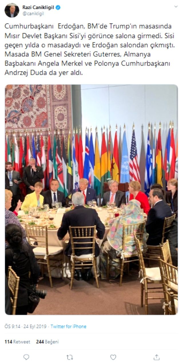 Gazeteci Razi Canikliğil'in aktardığına göre, Cumhurbaşkanı Erdoğan, BM'deABD Başkanı Donald Trump'ın masasında Mısır diktatörü Abdulfettah es-Sisi'yi görünce salona girmedi. Sisi geçen yıl da o masadaydı ve Erdoğan salondan çıkmıştı. Masada BM Genel Sekreteri Antonio Guterres, Almanya Başbakanı Angela Merkel ve Polonya Cumhurbaşkanı Andrzej Duda da yer aldı.