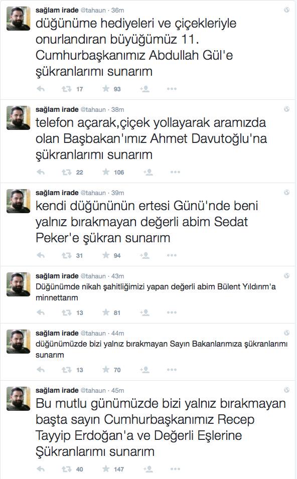 Taha Ün, 13 Haziran'da gerçekleşen nikâh törenine katılan ve kendisini kutlayanlara Twitter’dan şükranlarını sundu. Ün’ün teşekkür ettiği isimler arasında Cumhurbaşkanı
