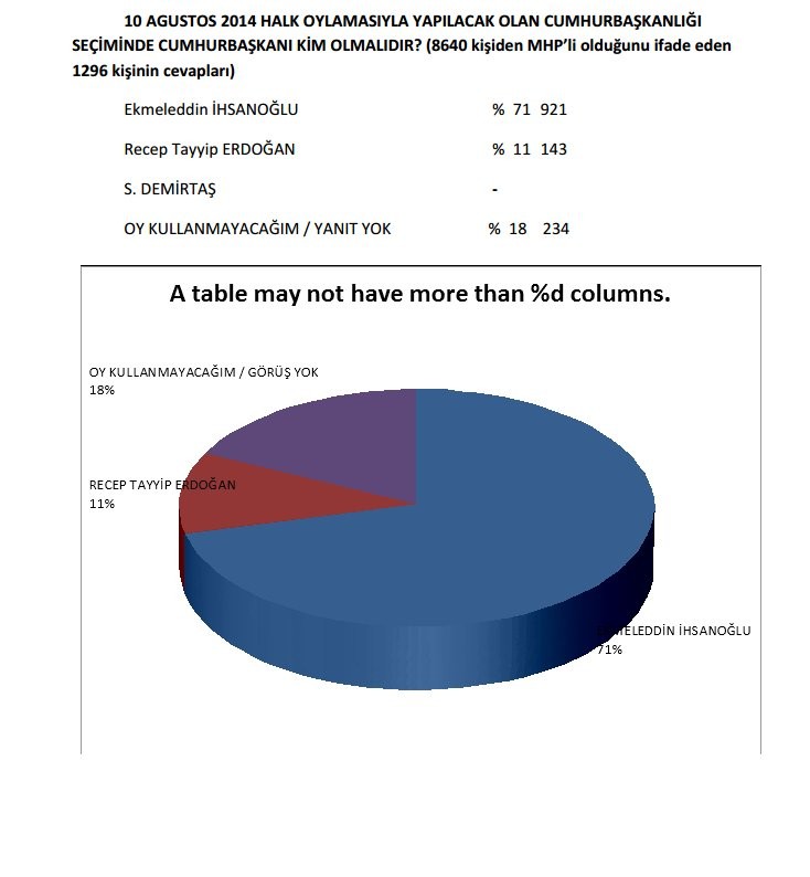 10 Ağustos 2014 tarihinde yapılacak olan Cumhurbaşkanlığı seçimi öncesi anketlerdeki durum dikkat çekiyor. MHP, CHP ve Paralel Cemaat'in belirlediği 'dam adayı' Ekmeleddin İhsanoğlu genel sonuçlarda Recep Tayyip Erdoğan'ın yarısı kadar dahi oy alamıyor.