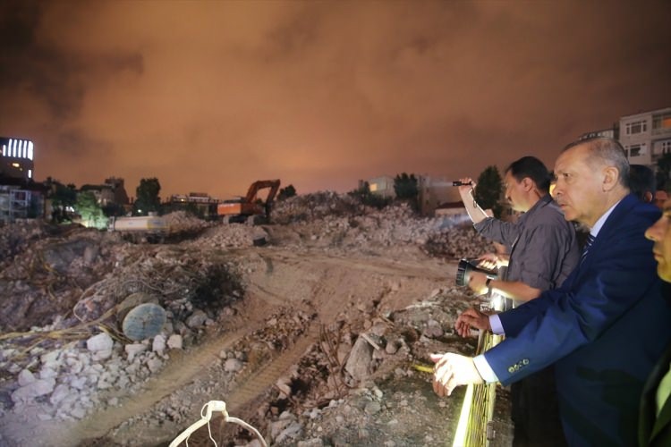 Erdoğan, beraberindekilerle Taksim Meydanı'nda yapımı devam eden cami inşaatını inceledi. Yapım aşamasına ilişkin yetkililerden bilgi alan Erdoğan, daha sonra yürüyerek yıkılan AKM binasının inşaat alanına geldi.