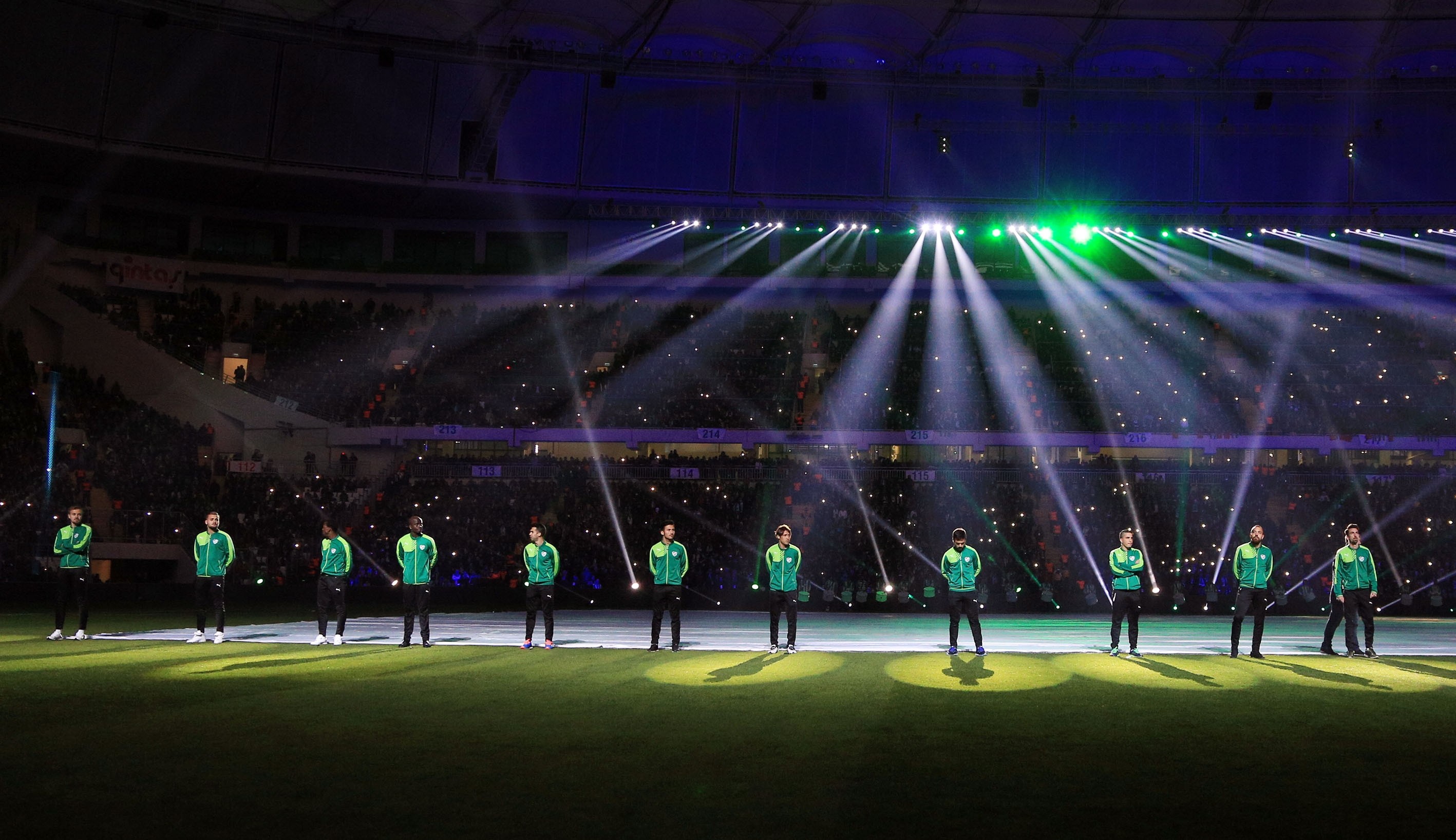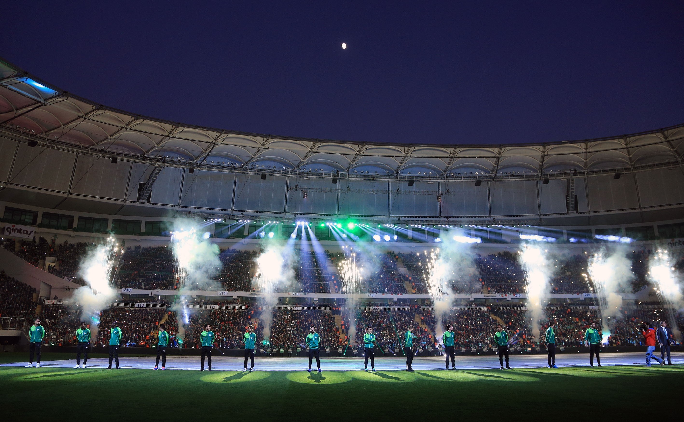 Açılışın ardından Erdoğan sahaya çıkarak eski futbolcularla selamlaştı ve hatıra fotoğrafı çektirdi. Timsah Arena'da ilk başlama vuruşunu Cumhurbaşkanı Recep Tayyip Erdoğan yaptı.