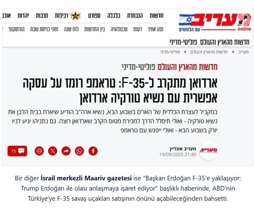 Bir diğer İsrail merkezli Maariv gazetesi ise "Başkan Erdoğan F-35'e yaklaşıyor: Trump Erdoğan ile olası anlaşmaya işaret ediyor" başlıklı haberinde, ABD'nin Türkiye'ye F-35 savaş uçakları satışının önünü açabileceğinden bahsetti.