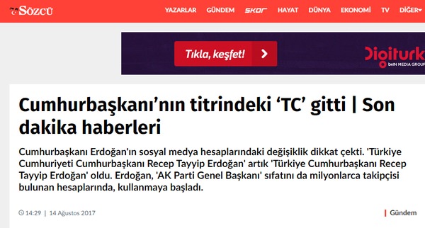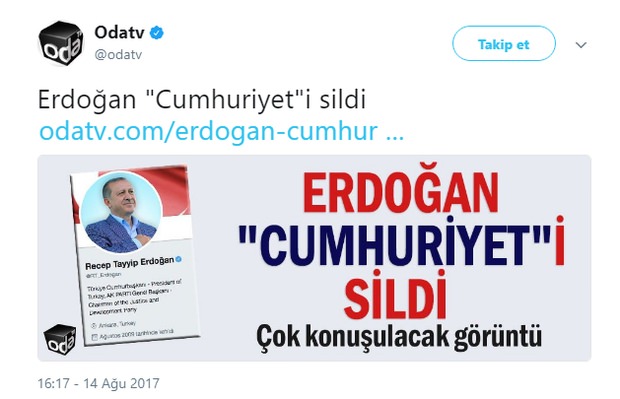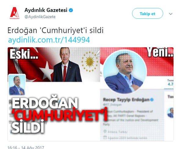 Cumhurbaşkanı Erdoğan'ın sosyal medya hesaplarında titrinin 'Türkiye Cumhurbaşkanı' şeklinde yer alması sebebiyle 'Erdoğan cumhuriyeti sildi' şeklinde algı operasyonu yapan bazı gazetelere tokat gibi bir cevap geldi.