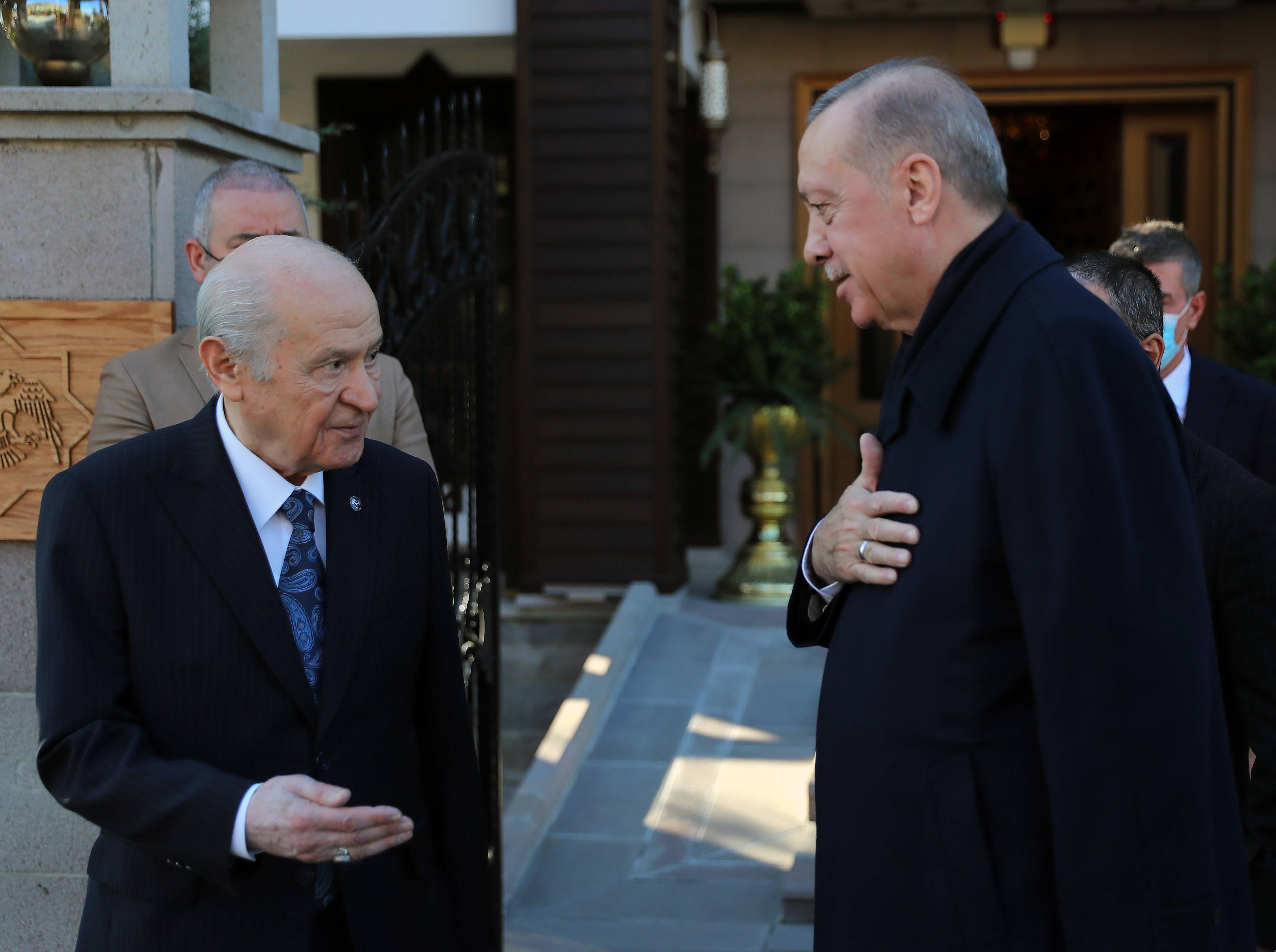 Bahçeli'nin, Cumhurbaşkanı Erdoğan'ı kapıda karşılamasıyla başlayan görüşmede gündeme ilşkin değerlendirmeler yapıldı.