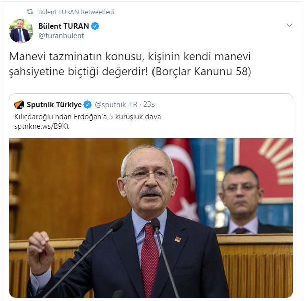 Konuya dair Twitter hesabından açıklama yapan AK Parti Grup Başkanvekili ve Çanakkale Milletvekili Bülent Turan, Kılıçdaroğlu'nu rezil eden gerçeği açıkladı. Turan, Borçlar Kanunu'nun 58'inci maddesine atıfta bulunarak, "Manevi tazminatın konusu, kişinin kendi manevi şahsiyetine biçtiği değerdir!" ifadelerini kullandı.