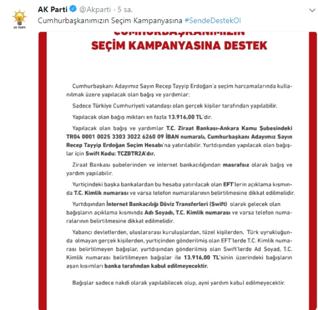 AK Parti'nin sosyal medya hesaplarından "Cumhurbaşkanımızın Seçim Kampanyasına Destek" başlığıyla yapılan paylaşımda, bağış ve yardımların hangi şartlar altında ve nerelere yapılabileceği hakkında bilgi verildi.