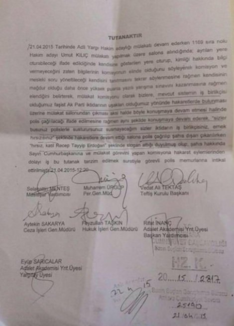 Hakimlik için mülakata giren Afyonkarahisar Barosu'na kayıtlı avukat Umut Kılıç'ın komisyona ve Cumhurbaşkanı Erdoğan'a yaptığı hakaretler tutanaklarda belgelendi.