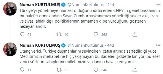 AK Parti Genel Başkanvekili Numan Kurtulmuş, Cumhurbaşkanı Recep Tayyip Erdoğan'a hakaret eden CHP Genel Başkanı Kemal Kılıçdaroğlu için, "Utanç verici, Türkiye düşmanlarını sevindiren, çatısı altında sarfedildiği yüce Meclisimizin mehabetine hiç yakışmayan bu ifadeleri şiddetle kınıyor, bu esef verici sözlerin sahiplerini milletimizin vicdanına havale ediyoruz" dedi.