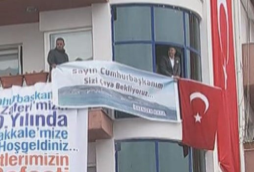 Cumhurbaşkanı Erdoğan'ın Çanakkale'de yaptığı konuşma esnasında bir vatandaş balkonuna "Sayın Cumhurbaşkanım sizi çaya bekliyoruz" pankartı astı.