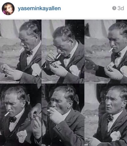 Muhteşem Yüzyıl'ın çakma Defne Sultan'ı olan Yasemin Allen, sirozdan ölen Mustafa Kemal'in sigarasını yakarken ve içerken çekilen fotoğraflarını İnstagram hesabından paylaşarak Cumhurbaşkanı Erdoğan'a göndermede bulundu.