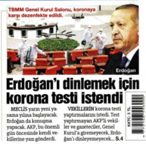Hükümete artık nereden saldıracağını şaşıran Sözcü, Erdoğan’ın konuşmasını dinleyebilmek için koronavirüs testinin yaptırılmasının istendiğini, AK Partili vekiller ve gazetecilerin test yaptırmaması durumunda Erdoğan’ın konuşmasını dinleyemeyeceklerini yazdı.