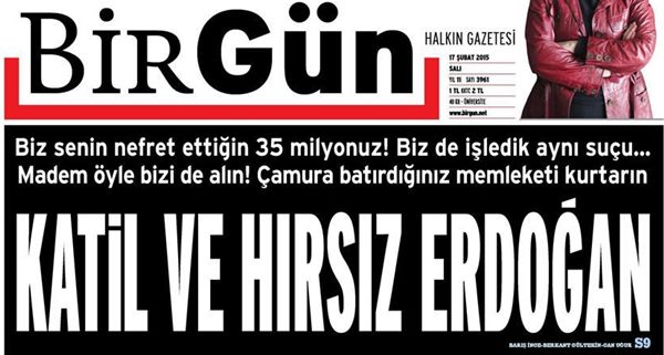 PKK-CHP karışımından meydana gelen ve gazete olduğu iddia edilen Birgün, manşetten iri puntolarla Cumhurbaşkanı Erdoğan'a iftirada bulunarak hakaret etti. Manşetteki "Bizi de içeri alın" talebine savcıların olumlu cevap vermesi bekleniyor.