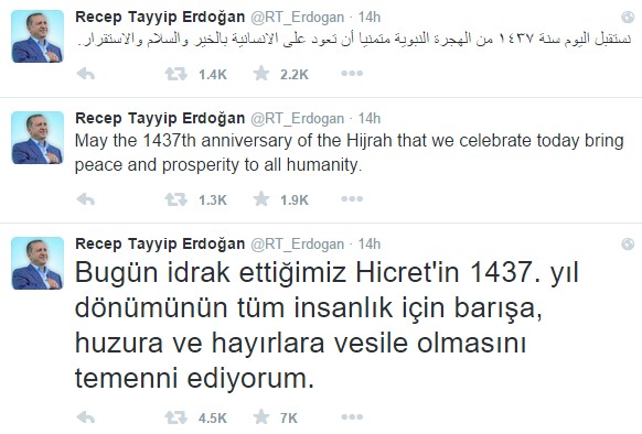 Cumhurbaşkanı Recep Tayyip Erdoğan, Hicret'in 1437. yıldönümü dolayısıyla Twitter hesabından Türkçe, Arapça ve İngilizce mesaj yayınladı.