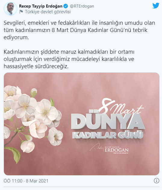 Cumhurbaşkanı Recep Tayyip Erdoğan, sosyal medya hesabından 8 Mart Dünya Kadınlar Günü ile ilgili bir paylaşımda bulundu.