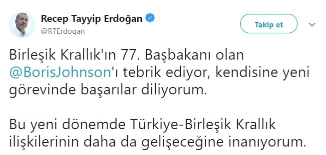 Erdoğan, paylaşımında, "Birleşik Krallık'ın 77. Başbakanı olan Boris Johnson'ı tebrik ediyor, kendisine yeni görevinde başarılar diliyorum. Bu yeni dönemde Türkiye-Birleşik Krallık ilişkilerinin daha da gelişeceğine inanıyorum." ifadelerine yer verdi.
