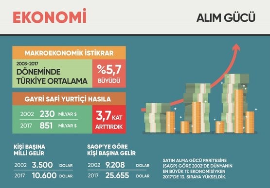 Satın Alma Gücü Paritesi'ne (SAGP) göre, 2002'de 9 bin 208 dolar olan kişi başına geliri, 2017'de 25 bin 655 dolara yükselttiklerini kaydeden Erdoğan, "SAGP'ye göre 2002'de dünyanın en büyük 17. ekonomisiyken 2017'de 13. sıraya yükseldik." değerlendirmesinde bulundu.