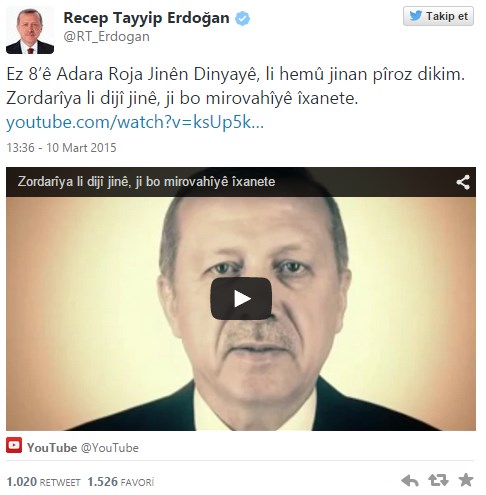 Cumhurbaşkanı Erdoğan'ın, Twitter'daki hesabından Kürtçe "8 Mart Dünya Kadınlar Günü münasebetiyle dünyadaki bütün kadınları kutluyorum" mesajı ile spotun Kürtçe altyazılı görüntüsü paylaşıldı.