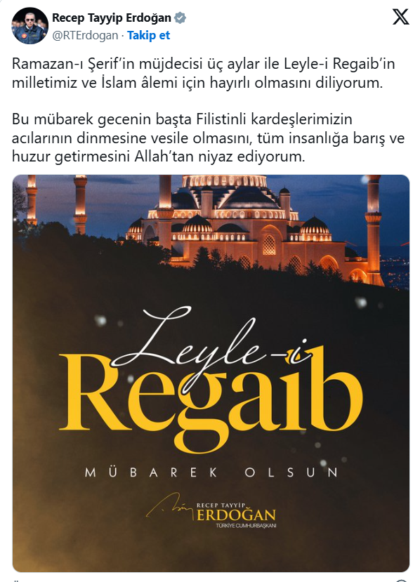 Başkan Recep Tayyip Erdoğan sosyal medya hesabından üç aylar ile Regaib Kandili için mesaj yayımladı.