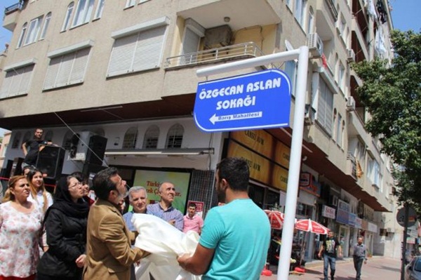 Barış Mahallesi muhtarı Metin İlkyaz ve mahalle sakinlerinin girişimiyle 4508. Sokak adının "Özgecan Aslan Sokağı" olarak değiştirilmesi dolayısıyla düzenlenen törene, Özgecan'ın annesi Songül, babası Mehmet, kardeşleri Beste ve Barış Ali Aslan ile vatandaşlar katıldı.