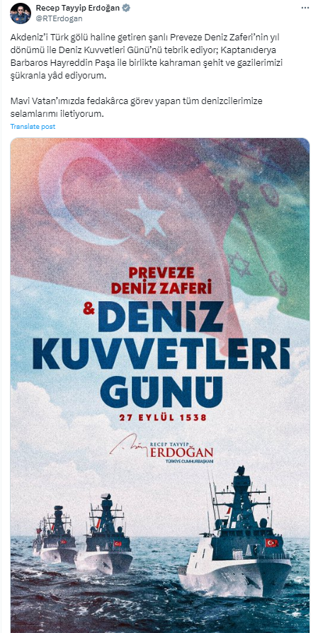 Erdoğan yaptığı fotoğraflı paylaşımda, 'Akdeniz'i Türk gölü haline getiren şanlı Preveze Deniz Zaferi'nin yıl dönümü ile Deniz Kuvvetleri Günü'nü tebrik ediyor; Kaptanıderya Barbaros Hayreddin Paşa ile birlikte kahraman şehit ve gazilerimizi şükranla yâd ediyorum. Mavi Vatan'ımızda fedakârca görev yapan tüm denizcilerimize selamlarımı iletiyorum' ifadelerini kullandı.