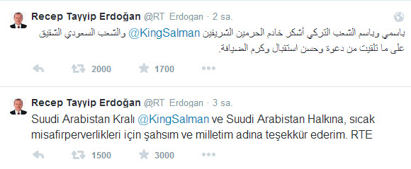 Cumhurbaşkanı Recep Tayyip Erdoğan, Suudi Arabistan Kralı Selman bin Abdülaziz el-Suud'a Twitter üzerinden Türkçe ve Arapça olarak teşekkür etti. Erdoğan mesajında, "Suudi Arabistan Kralı ve Suudi Arabistan Halkına, sıcak misafirperverlikleri için şahsım ve milletim adına teşekkür ederim" dedi.
