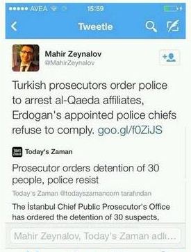 Başbakan Erdoğan, Today's Zaman yazarı Mahir Zeynalov'un, Twitter'da paylaştığı mesajlarda "hakaret, halkı kin ve düşmanlığa tahrik veya aşağılama" yaptığı iddiasıyla suç duyurusunda bulundu.