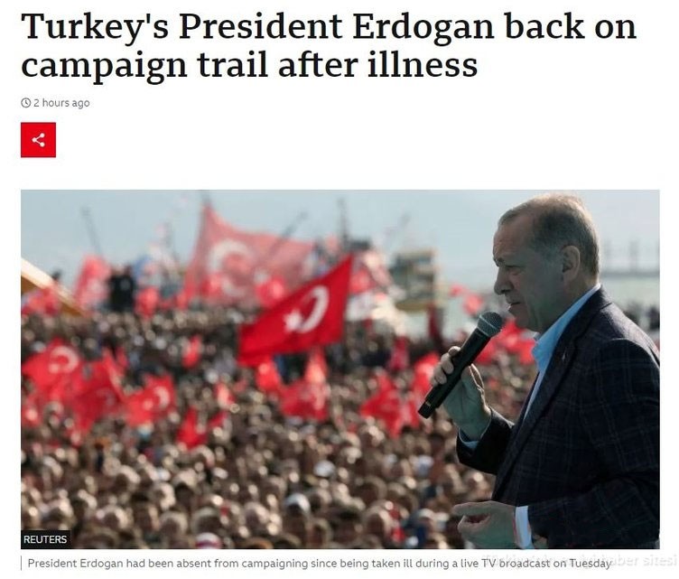 Geçtiğimiz günlerde geçirdiği rahatsızlığından eser olmadığı kaydedilen haberde BBC; Başkan Recep Tayyip Erdoğan'ın 40 dakika boyunca güçlü bir ses tonuyla konuşarak Türkiye'yi sadece kendisinin büyütebileceğini söylediğini aktardı.