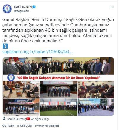 Her platformda sağlıktaki istihdam yetersizliğini dile getirdiklerini ve atama yapılması için mücadele verdiklerini kaydeden Durmuş, “Sağlık stratejik bir alan. Pandemi sürecinde bunu bir defa daha gördük. Alt yapı yatırımları insan kaynağı ile desteklenmediği sürece sağlıkta başarıdan söz edemeyiz. Pandemiyle birlikte sağlık çalışanları yoğun iş yükü altında ezildi. Sağlık-Sen olarak yoğun çaba harcadığımız ve neticesinde Cumhurbaşkanımız Recep Tayyip Erdoğan tarafından açıklanan 40 bin sağlık çalışanı istihdamı müjdesi, tüm sağlık çalışanlarına umut oldu. Atama yapılacak branşlar bir an önce belirlenmeli ve atama takvimi daha fazla vakit kaybetmeden açıklanmalıdır. Sahanın yangını hemen söndürülmelidir” ifadelerini kullandı. Düzenli olarak her yıl 60-70 bin alım yapılmasıyla birlikte sağlıkta istihdam açığının 5 yılda önemli ölçüde kapanacağına vurgu yapan Durmuş, bu konudaki mücadeleyi sürdürdüklerini belirtti.