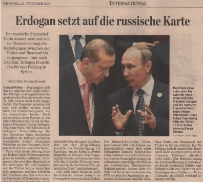 Avusturya'da yayın yapan Der Standard gazetesi, geniş yer ayırdığı Türk-Rus haberine "Erdoğan Rus kartına oynuyor" başlığını attı.