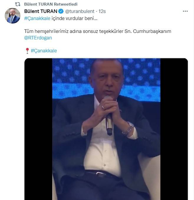 Turan “#Çanakkale içinde vurdular beni… Tüm hemşehrilerimiz adına sonsuz teşekkürler Sn. Cumhurbaşkanım @RTErdogan” ifadelerini kullandı
