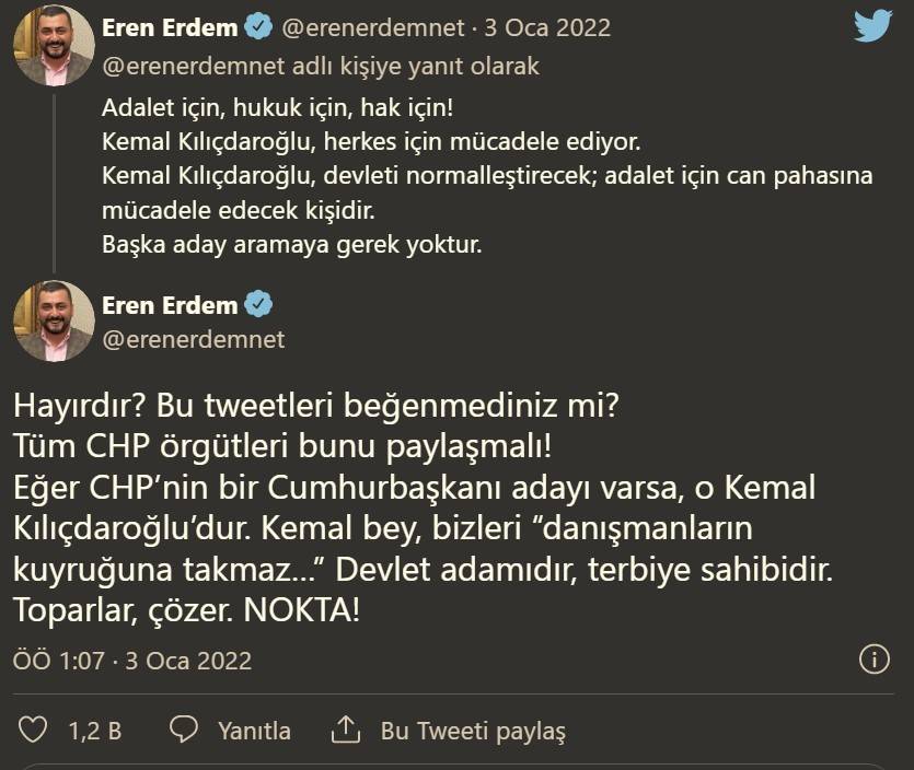 Erdem daha sonra, beklediği etkileşimi almaması üzerine, "Hayırdır? Bu tweetleri beğenmediniz mi? Tüm CHP örgütleri bunu paylaşmalı" mesajını paylaştı.