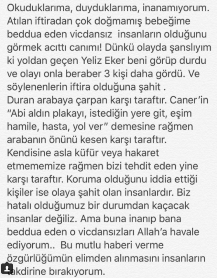 "Okuduklarıma, duyduklarıma, inanamıyorum. Atılan iftiradan çok, doğmamış bebeğime beddua eden vicdansız insanların olduğunu görmek acıttı canımı! Dünkü olayda şanslıyım ki yoldan geçen Yeliz Eker beni görüp durdu ve olayı onlar beraber 3 kişi daha gördü. Ve söylenenlerin iftira olduğuna şahit. Duran arabaya çarpan karşı taraftır. Caner'in "Abi plakayı aldın, istediğin yere git, eşim hamile, hasta, yol ver" demesine rağmen arabanın önünü kesen karşı taraftır. Kendisine asla küfür veya hakaret etmememize rağmen bizi tehdit eden yine karşı taraftır. Koruma olduğunu iddia ettiği kişiler ise olaya şahit olan insanlardır. Biz hatalı olduğumuz bir durumdan kaçacak insanlar değiliz. Ama buna inanıp bana beddua eden o vicdansızları Allah'a havale ediyorum... Bu mutlu haberi verme özgürlüğümün elimden alınmasını insanların takdirine bırakıyorum"